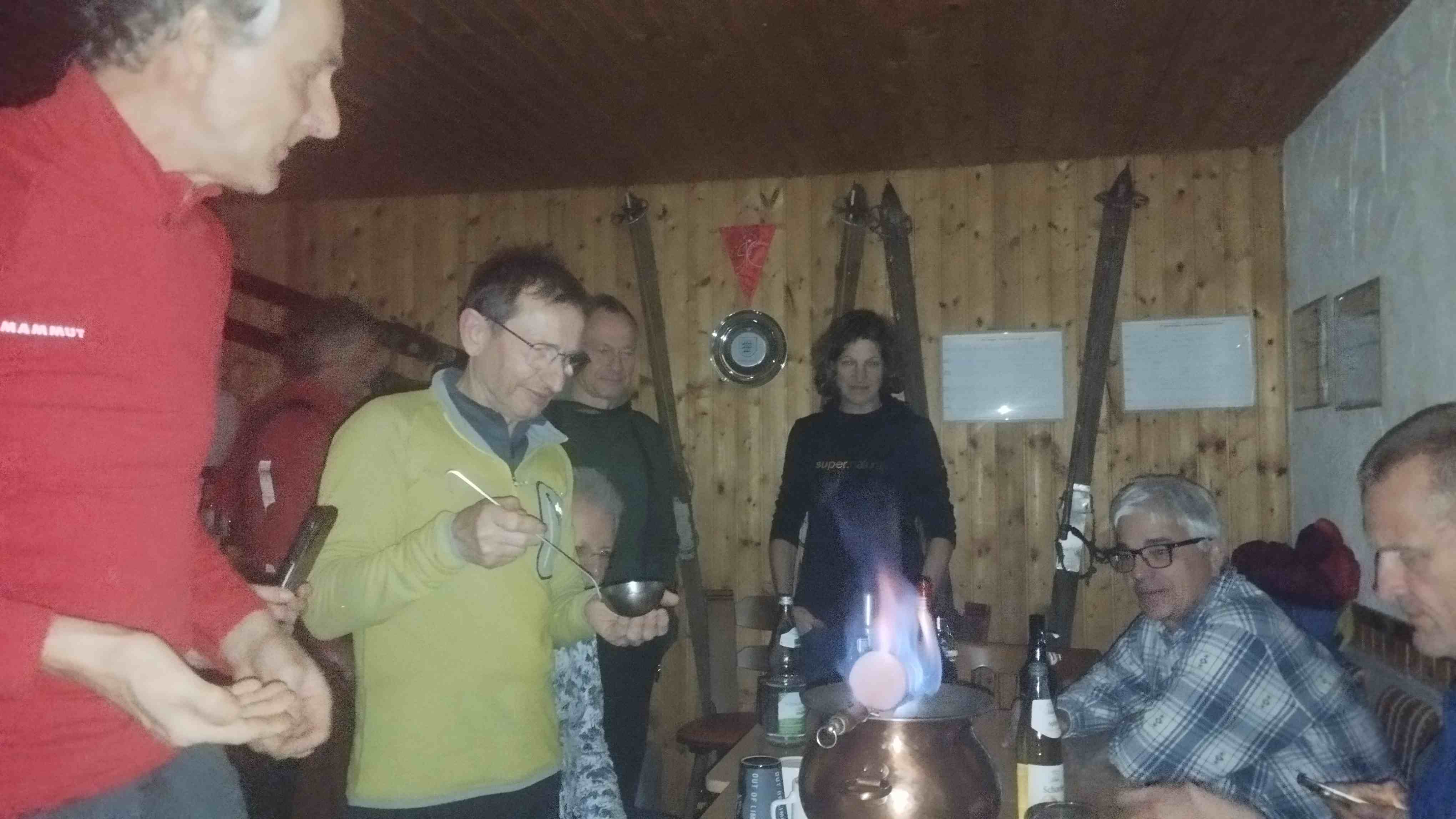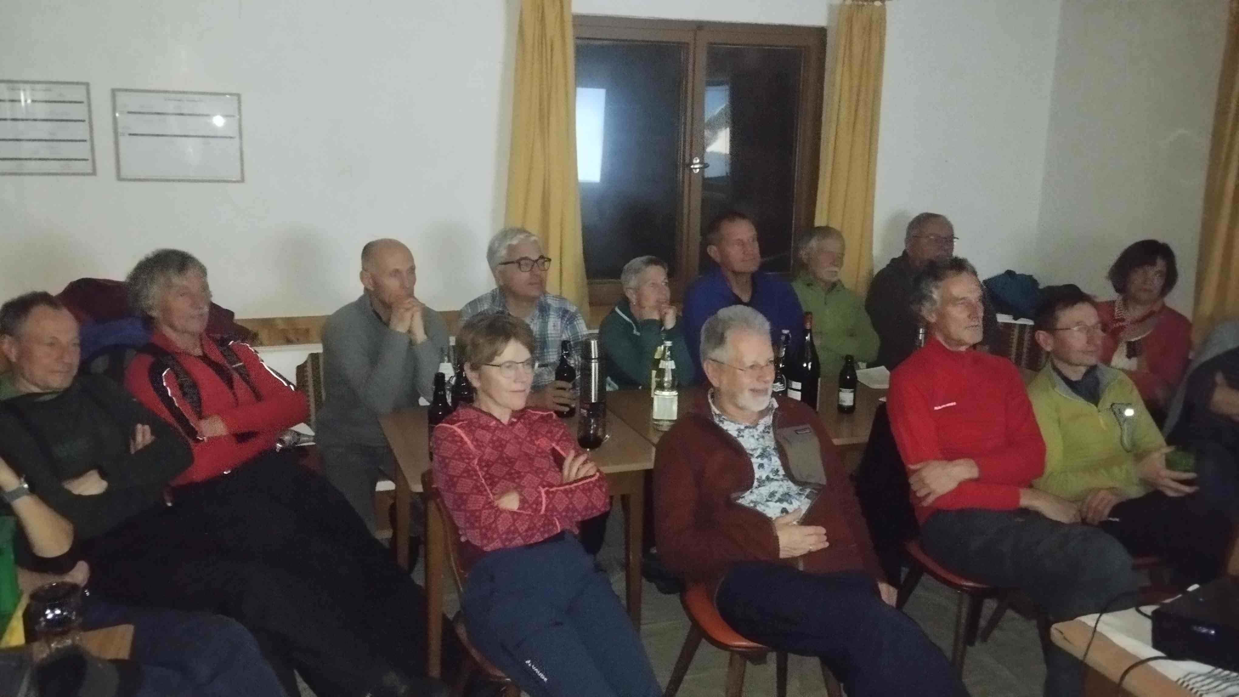 dazu Singen und Filme von vergangenen Skitouren - Schwerpunkt Videos 2012 Panixer Pass Hütte mit Hausstock und 2016 Mt. Velan. 16 Teilnehmer Gunter, Claus und Gabi, Konrad, Helmut, Bruno, Hubert und Raphaela, Rike und Fips, Norbert, Pit und Eva, Jürgen und Regina, Arno. Es war also eine große Sause.