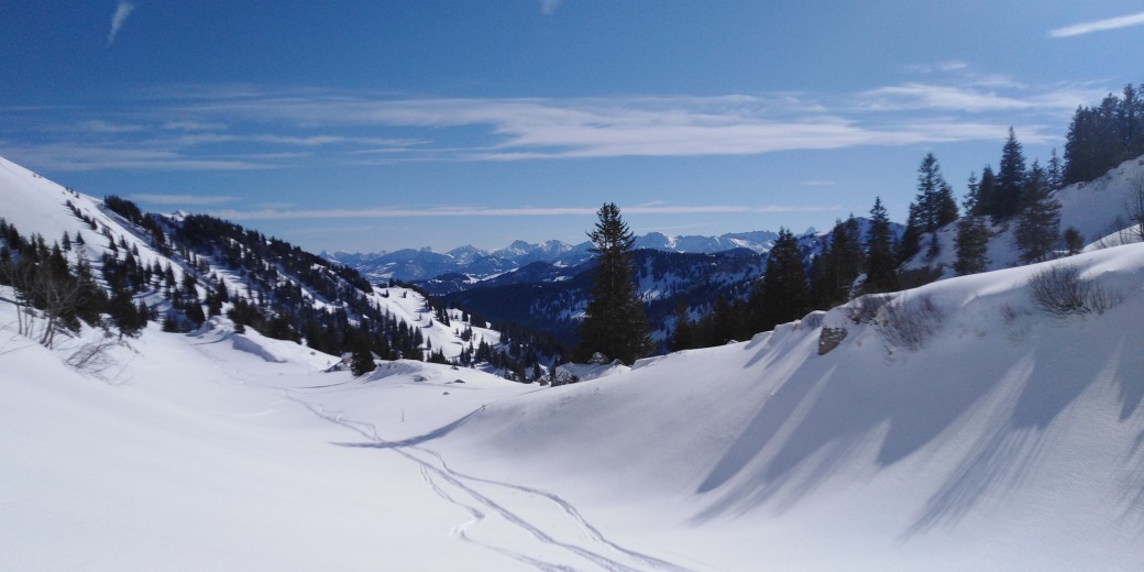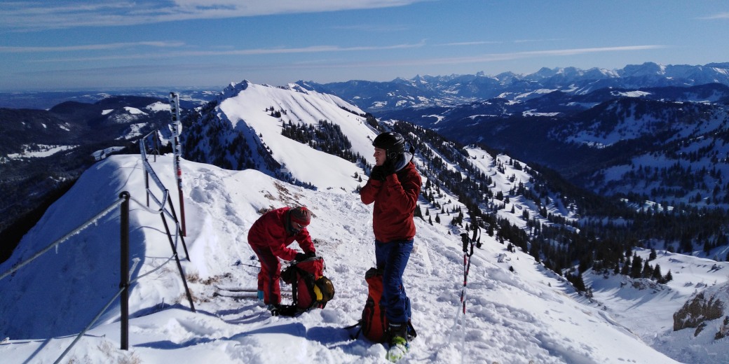 Tour 4 Nagelfluhkette von Oberstaufen / Allgäu mit der Hochgratbahn bis kurz unterm Hochgrat, dann die ganze Kette bis Immenstadt und Zug zurück nach Oberstaufen. Dies ist eine Imposante Tour mit nur ca. 1.000 hm Aufstieg und 2.000 m Abfahrt. Die Aufstiege sind auf Westhängen, die Abfahrten auf teils rassigen Osthängen und daher oft mit Pulver. Meinen besten Freunden biete ich am Vortag eine entspannte Anfahrt mit Hüttennachmittag und -abend auf dem Raunberg bei Wiggensbach an und nach der Tour einen 2. Hüttenabend mit Heimfahrt am nächsten Tag. Gemeldet bisher Claus, Helmut und Bruno Abfahrt Dienstag 8:00, retour Donnerstag Abend; Di und Do kleinere Tour Nähe Nagelfluh-Kette. Elfi kommt mit Woody und noch einem Kumpel fahren am Mittwoch. Ob der Schnee bis dahin noch ausreicht ist unsicher, weil es die Tage sehr warm war, checke die Schneelage nochmal Mo.