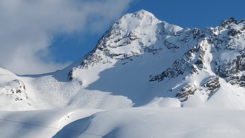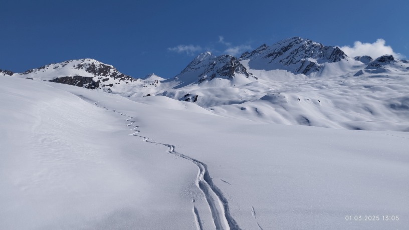 Am 2. Tag ging es hinter der Hütte hoch ins Plattenjoch 2.728m mit herrlichem Blick auf das Ziel Chli Seehorn .3.032m Aber der Gries verhinderte selbst für die kampferprobtesten den Aufstieg am letzten Gipfelaufbau - es gab quasi keinen Wiederstand unter den Füßen. Auf der Abfahrt war der Schnee oben verpresst, erst die letzten 500 hm zur Hütte belohnten uns mit einem rassigen Hang mit Traum-Pulver.