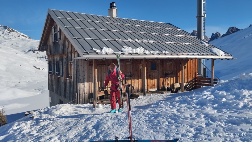 Tour 6 Heilbronner Hütte 2.308 m Verwall. Aufstieg von Partenen 1.200 hm, mit schwerem Rucksack lang und anstrengend. Wir hatten aber wieder Glück - mit 5-10 cm Neuschnee konnten wir bereits am Parkplatz anfellen und der Pulver war schnell und nicht tief. So erreichten wir bereits ab 13 Uhr die Hütte und manche haben noch den Hausberg drangehängt.