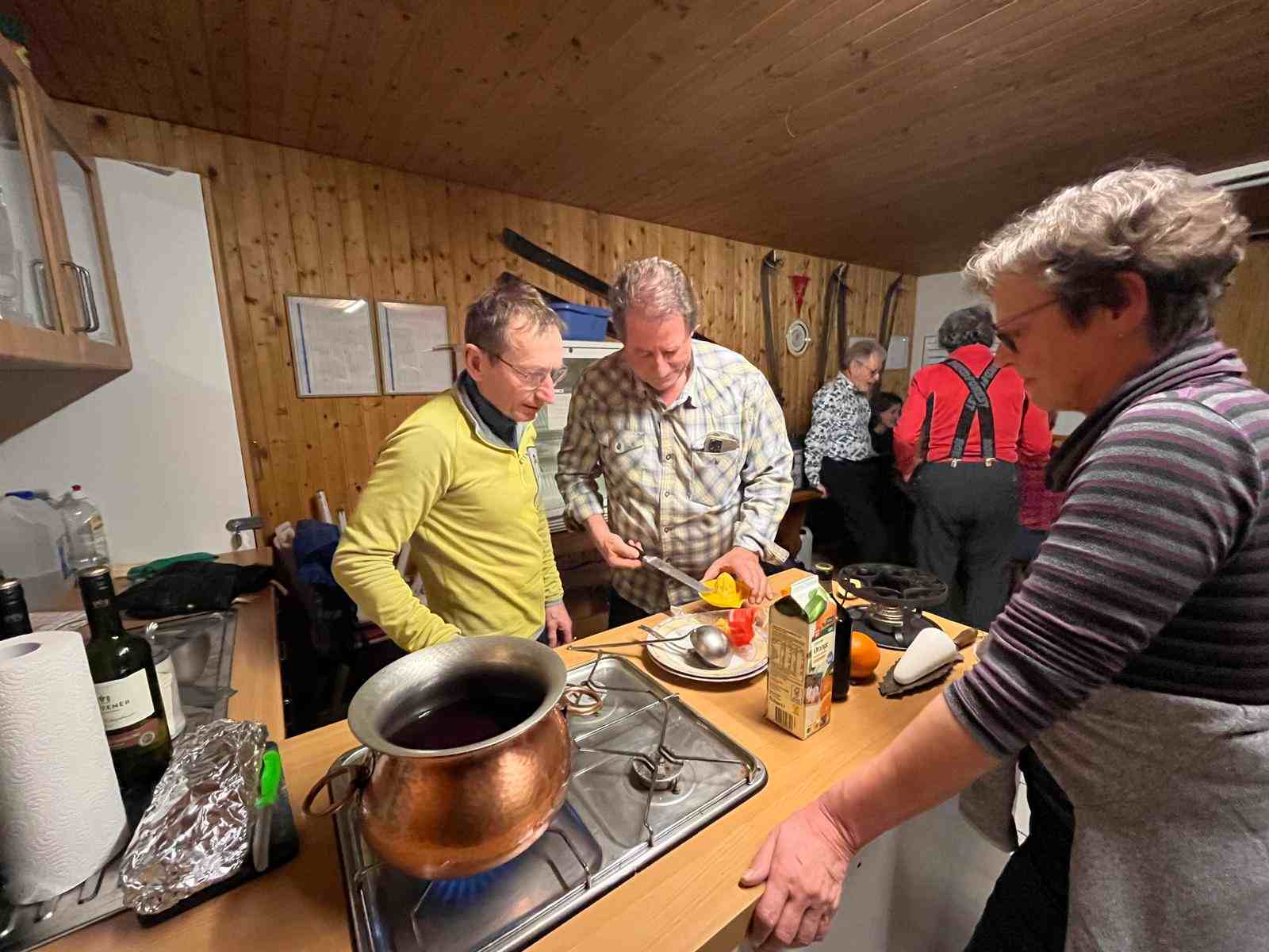 mit Glühwein und Kuchen von Pit an der Schüler Kapelle und ab 17-18 Uhr Treffen in der Skihütte zur großen Sause: Fips brachte Chili con ccarne für alle und eine Mega Flasche alten Rotwein, danach Apple Crumble Dessert mit Custard (Gunter), und Apfelbrot und Erdnüsse (Jürgen und Regina)